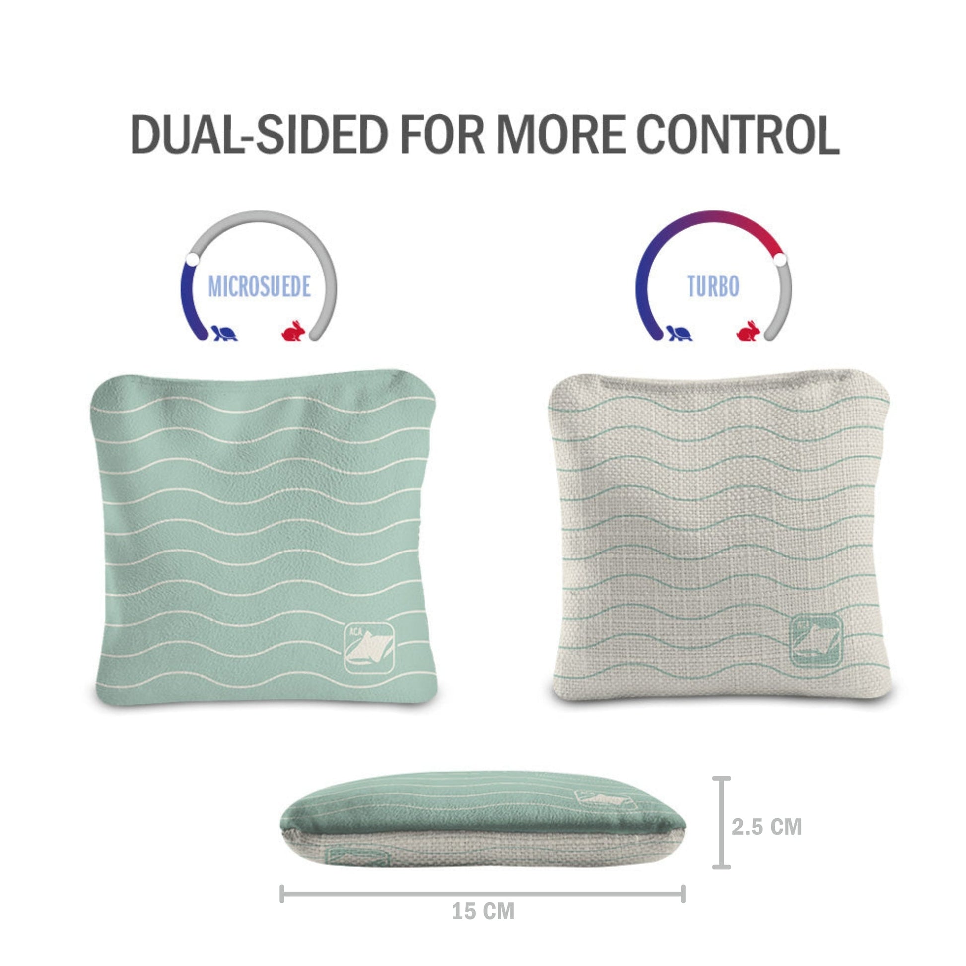 De dubbelzijdige materiaalconstructie van de ACA Synergy Pro Professional Regulation Cornhole Bags verbetert de spelstrategie en controle, waardoor je zakjes met de ene kant glijden en met de andere kant blijven liggen op de plaats waar ze neerkomen. Dankzij de verschillende grafische opties kunnen sets worden gecombineerd en gematcht voor elke stijl.